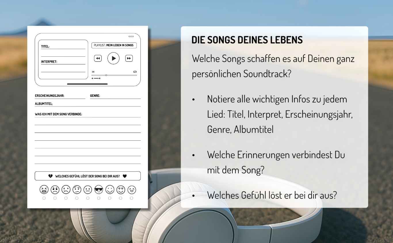 Sammle die wichtigsten Songs Deines Lebens und die damit verbundenen Erinnerungen in dem kompakten Notizbuch „Mein Leben in Songs“!