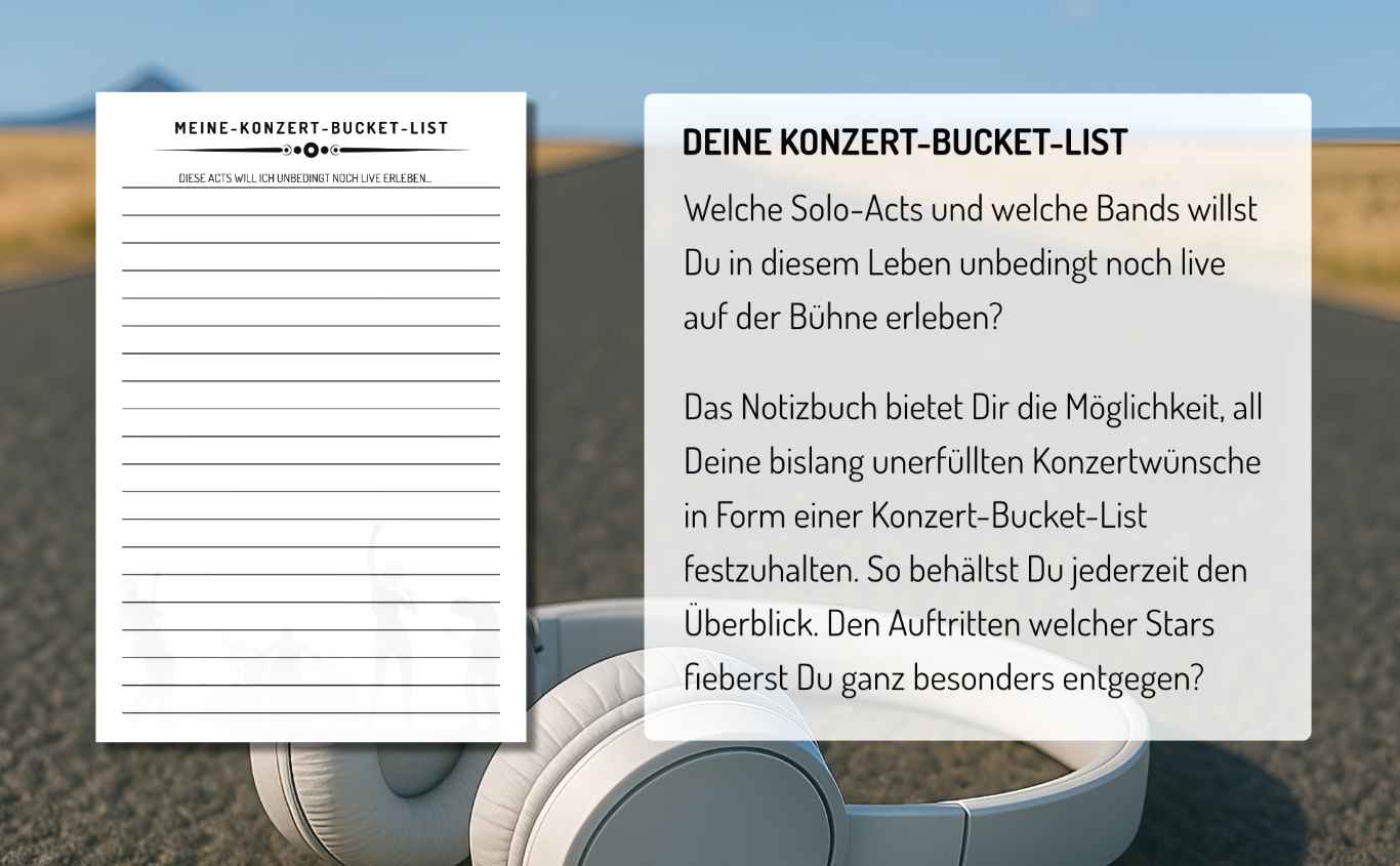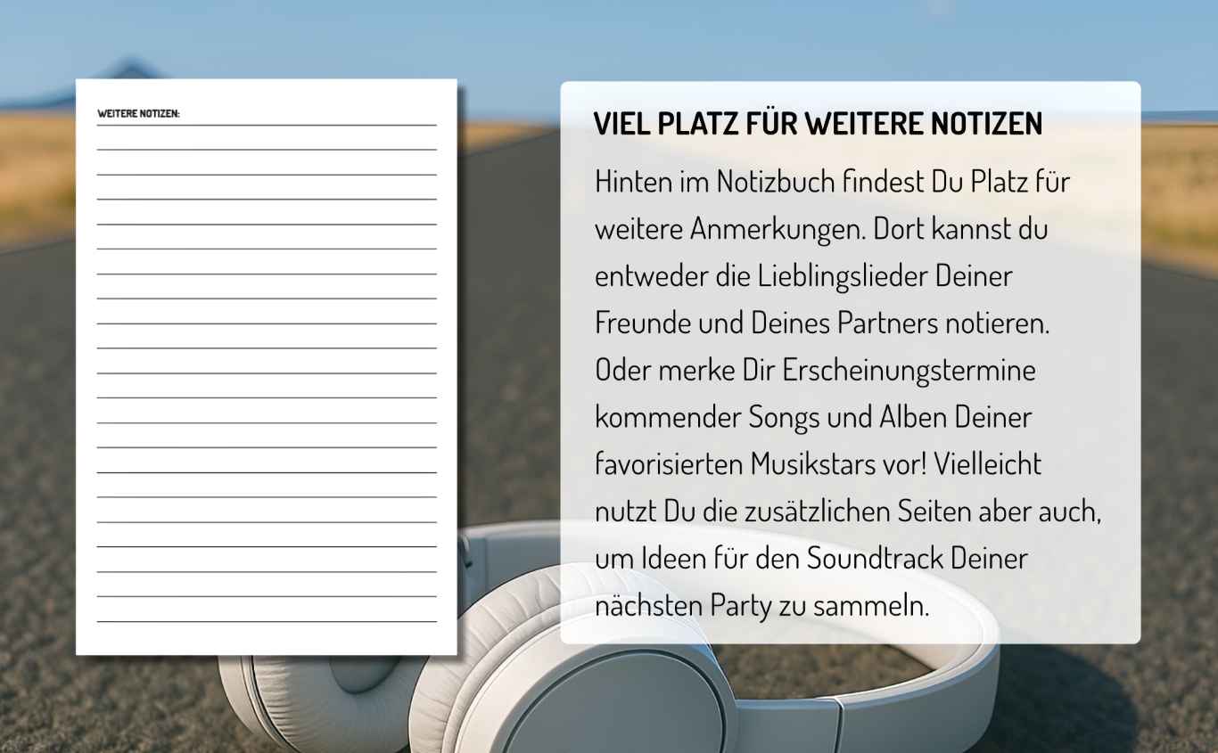 In diesem Notizbuch kannst Du Deine Song-Erinnerungen für die Ewigkeit festhalten. Es bietet Dir außerdem die Möglichkeit, Favoritenlisten mit Lieblingssongs sowie eine Konzert-Bucket-List anzulegen. Darüber hinaus findest Du darin Platz für freie Notizen.